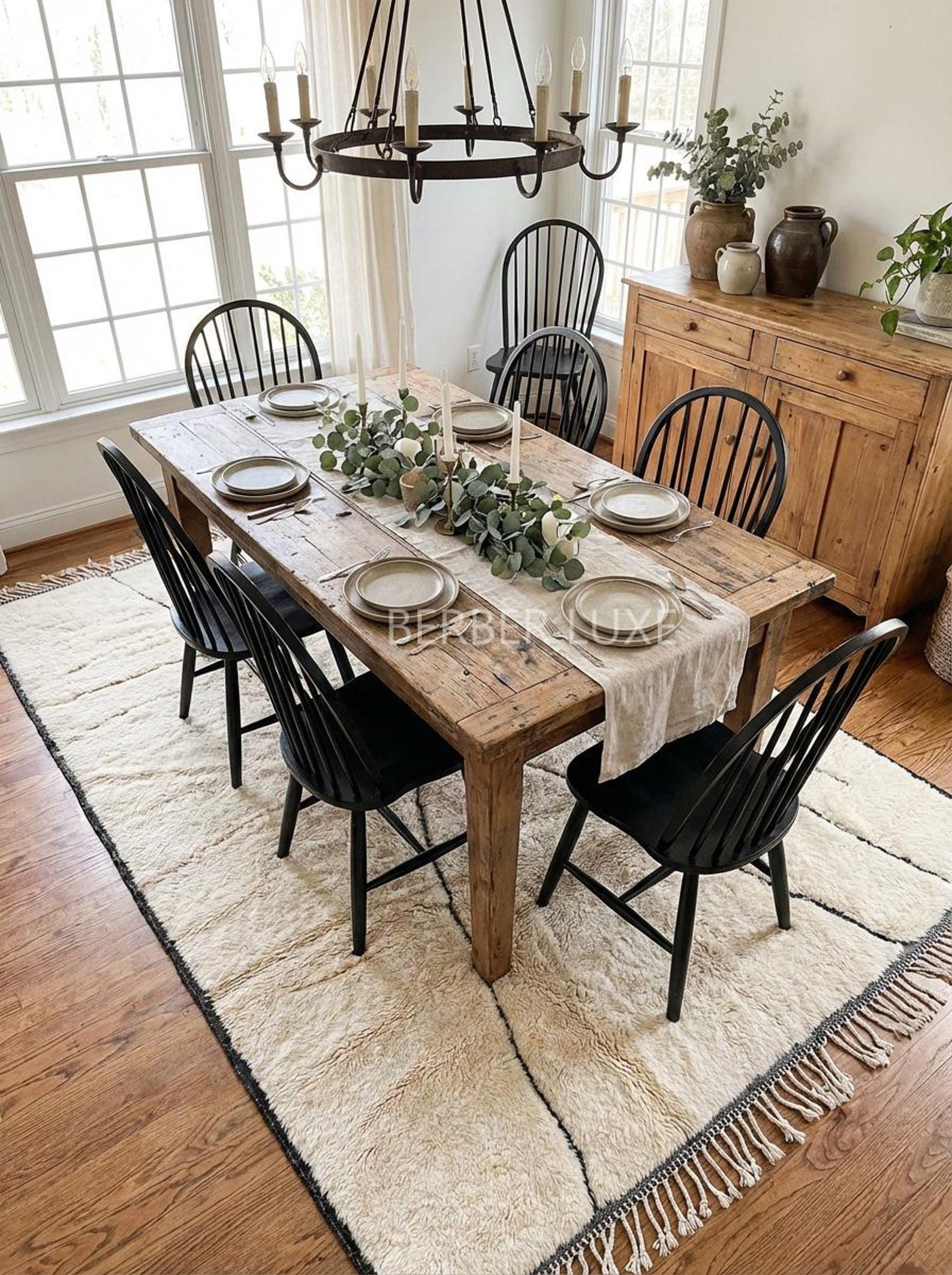 Modern Farmhouse: The graphic lines complement the rustic wood and metal accents typical of farmhouse decor.