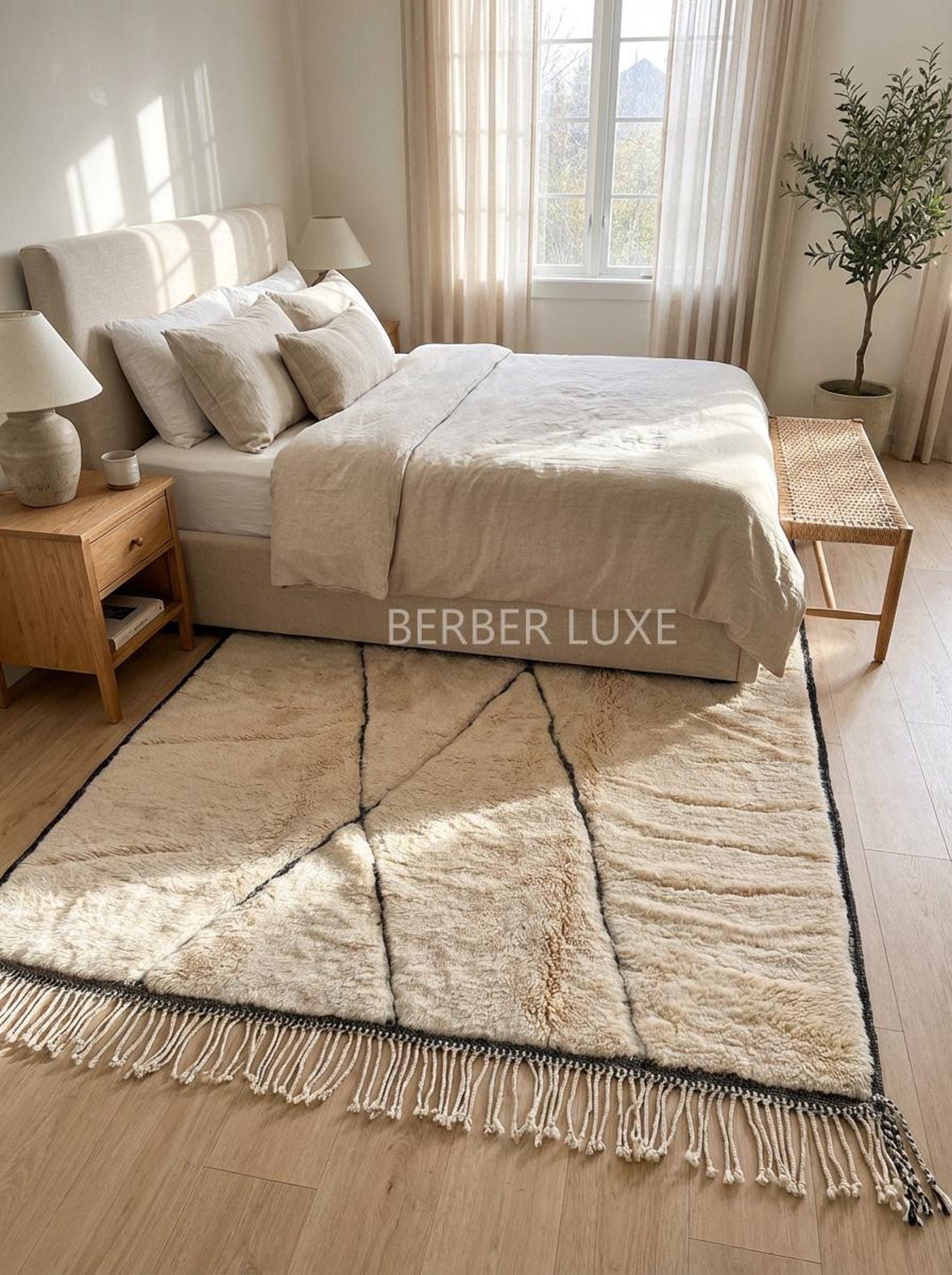 Boho-Chic Bedroom: Layer it with rattan furniture and green plants. The tribal patterns of this Beni Ourain style rug add that necessary touch of “global traveler” charm.