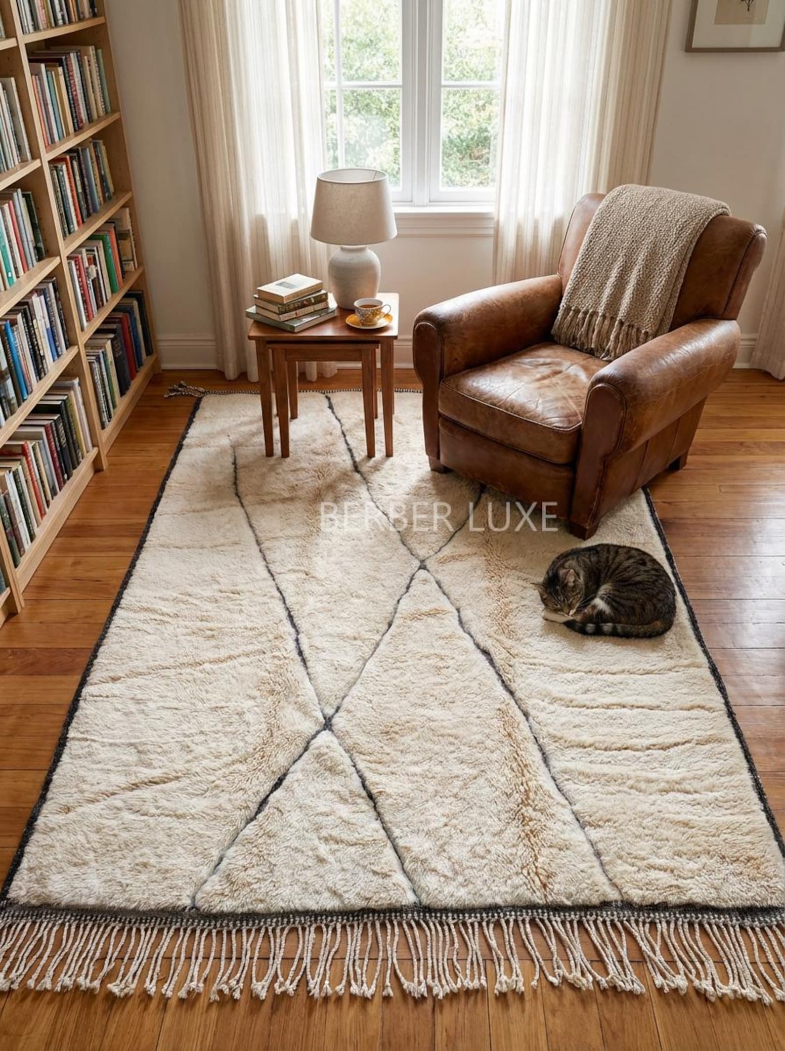 A rug black and white is more than just a decor choice; it is a design strategy. The interplay between the deep, rich black motifs and the creamy, natural white wool creates a visual balance that anchors furniture and defines spaces.